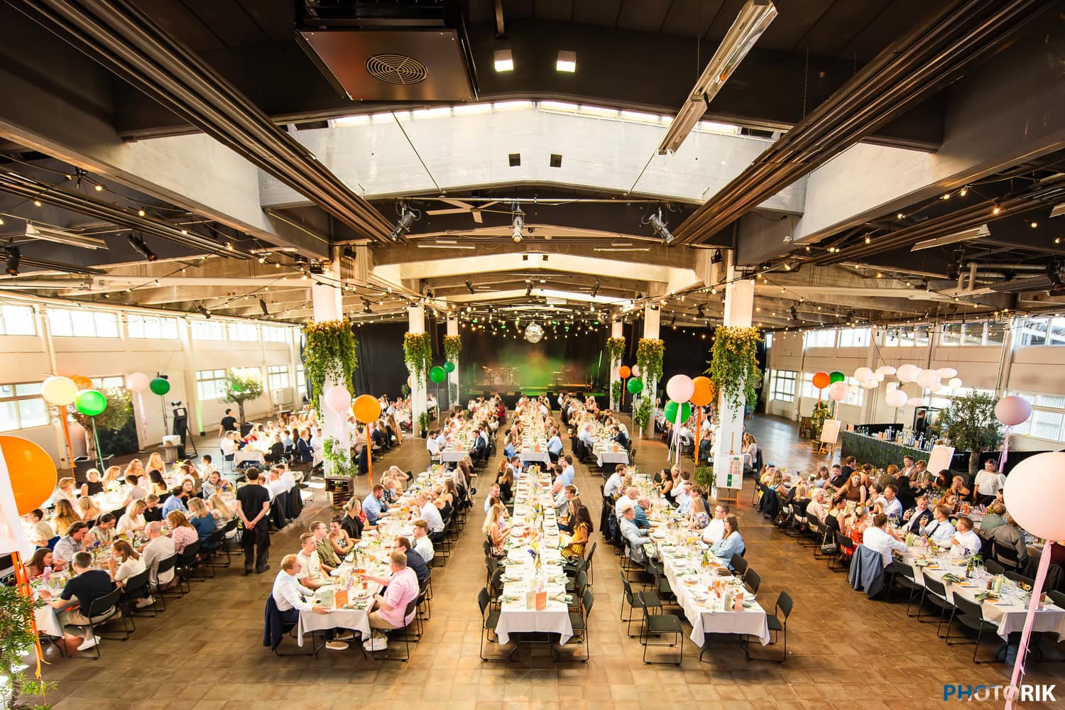 Een ruime, lichtovergoten evenementenruimte met decoratieve ballonnen en groene planten voor een feest of receptie.